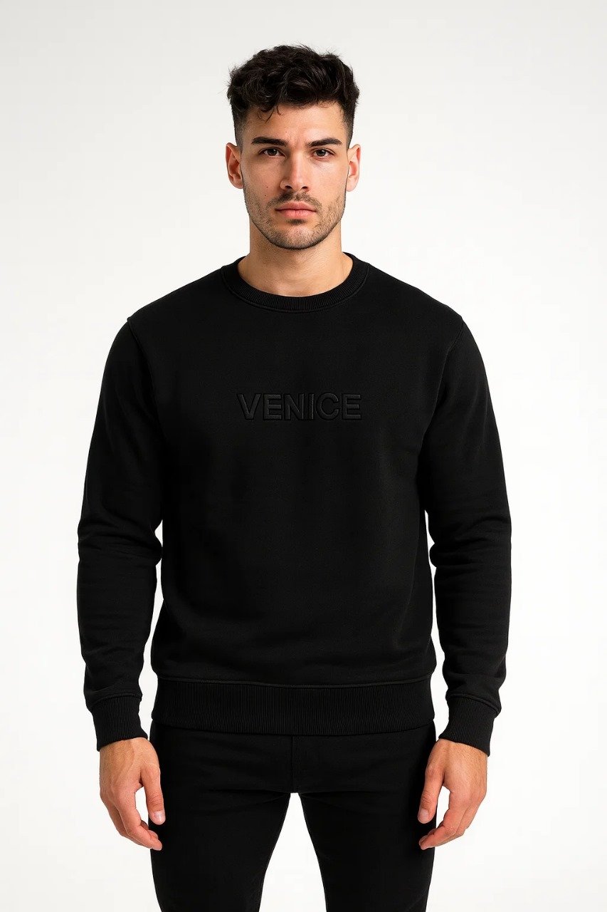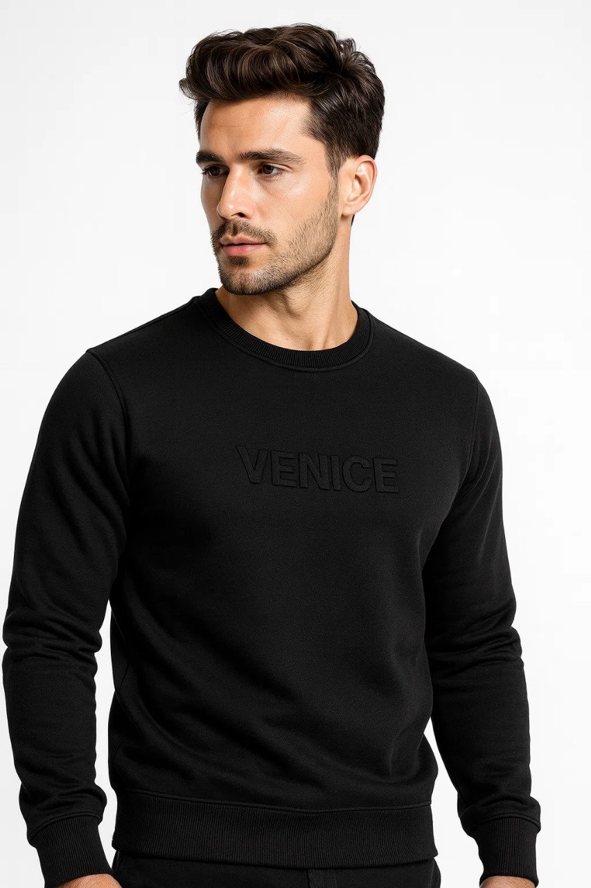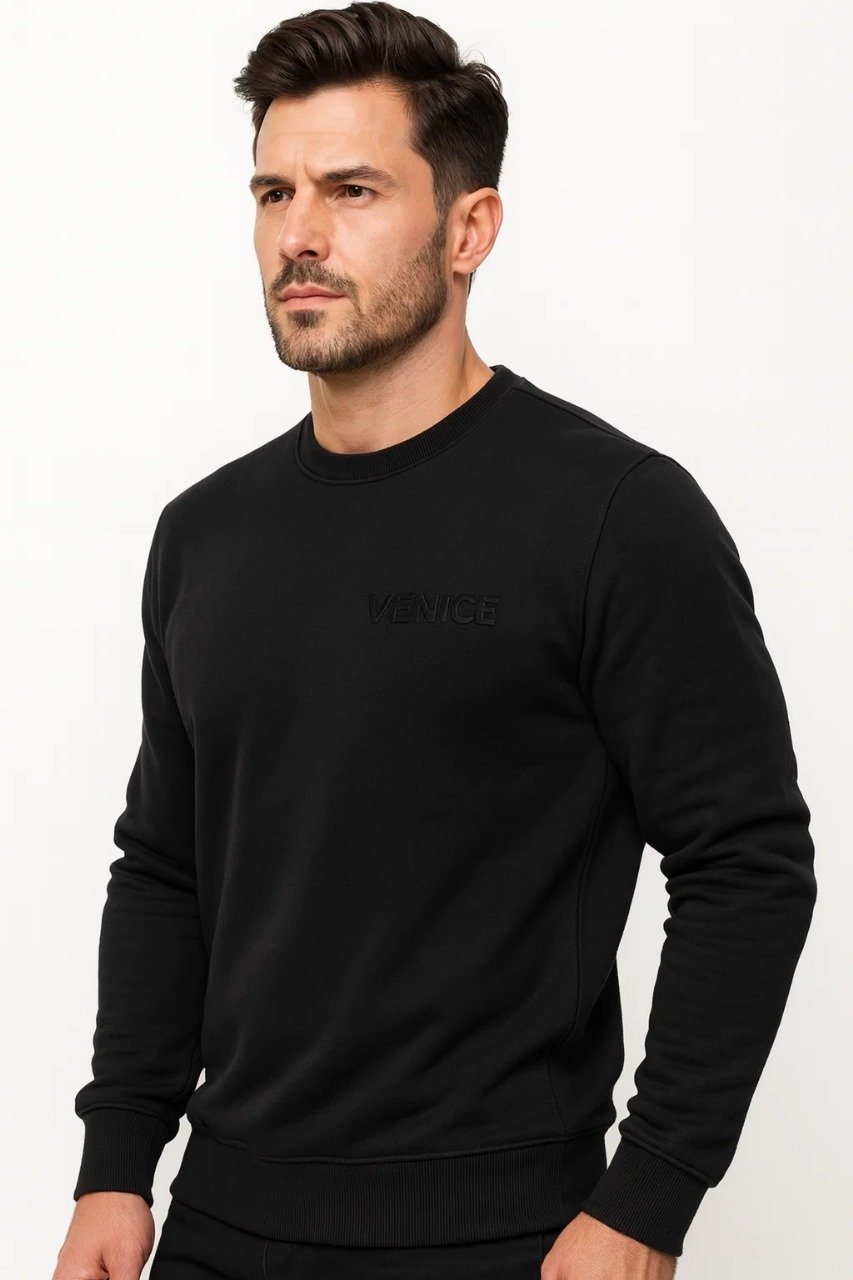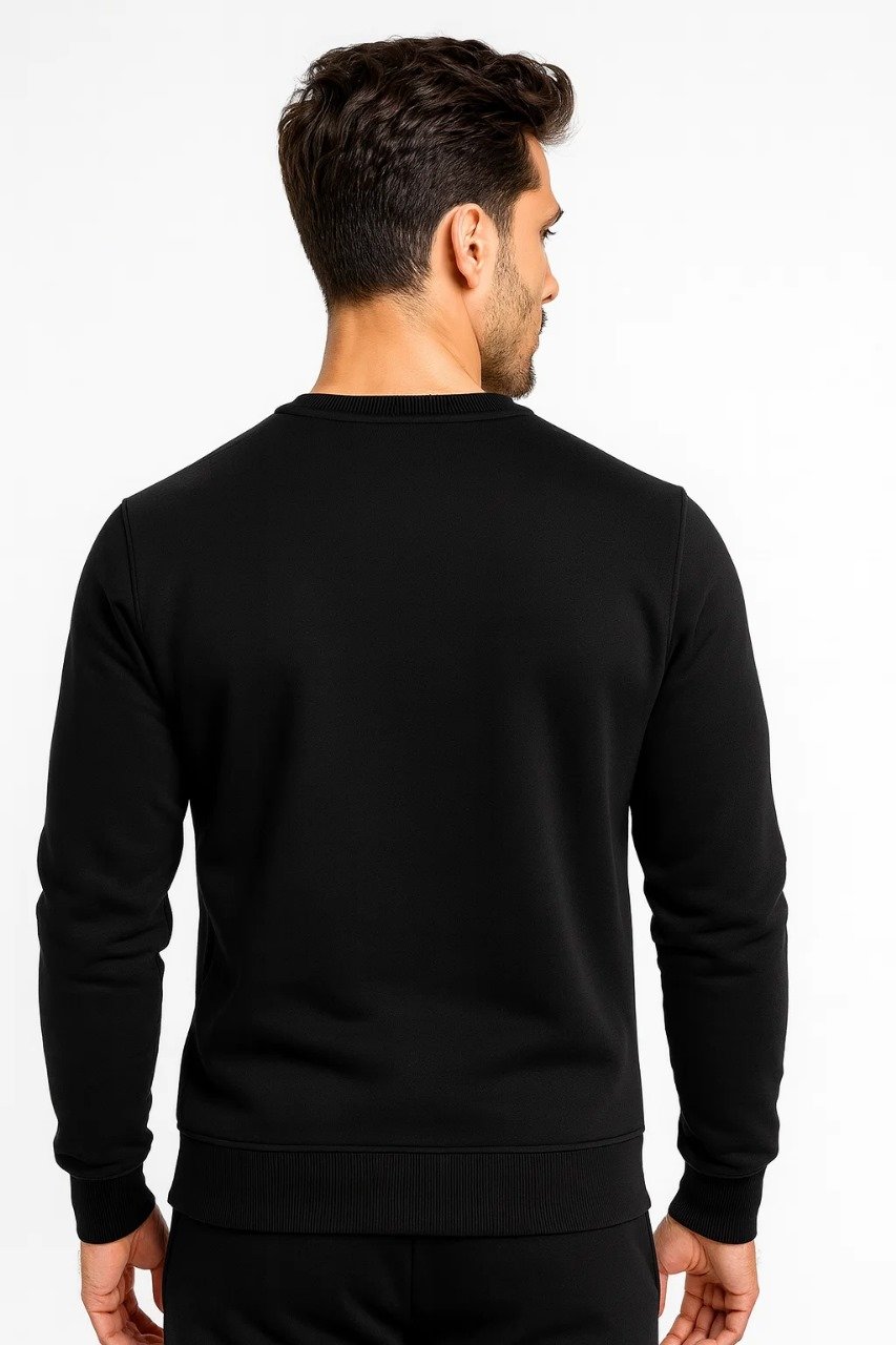 Black solid sweatshirt, has a round neck, long sleeves, straight hem.