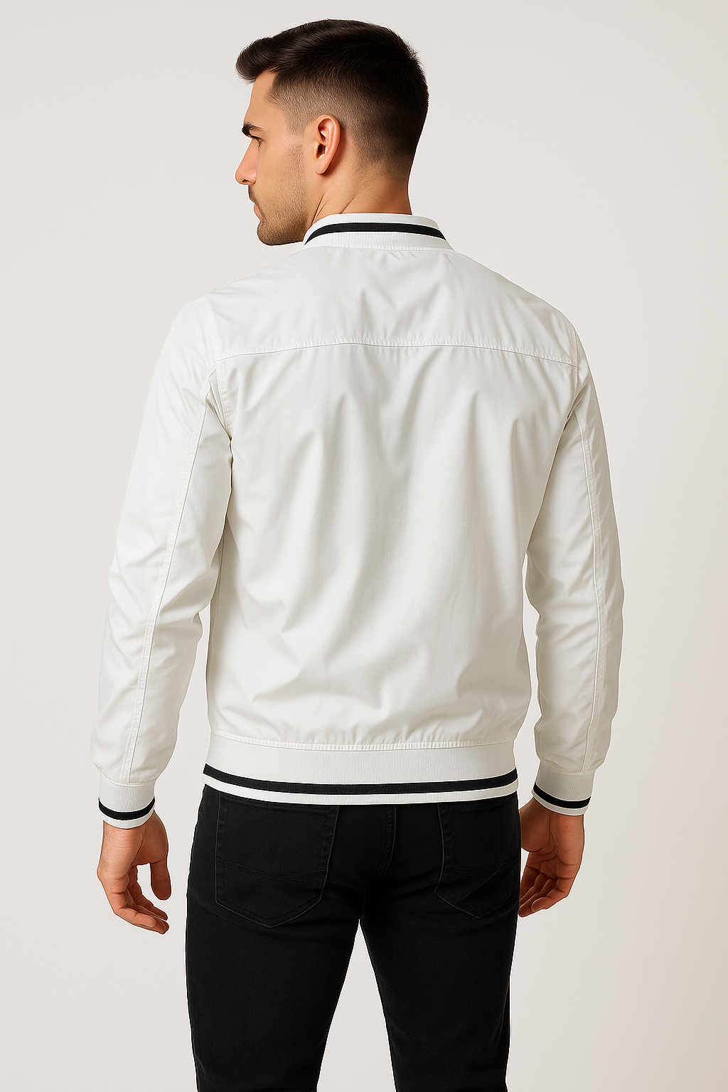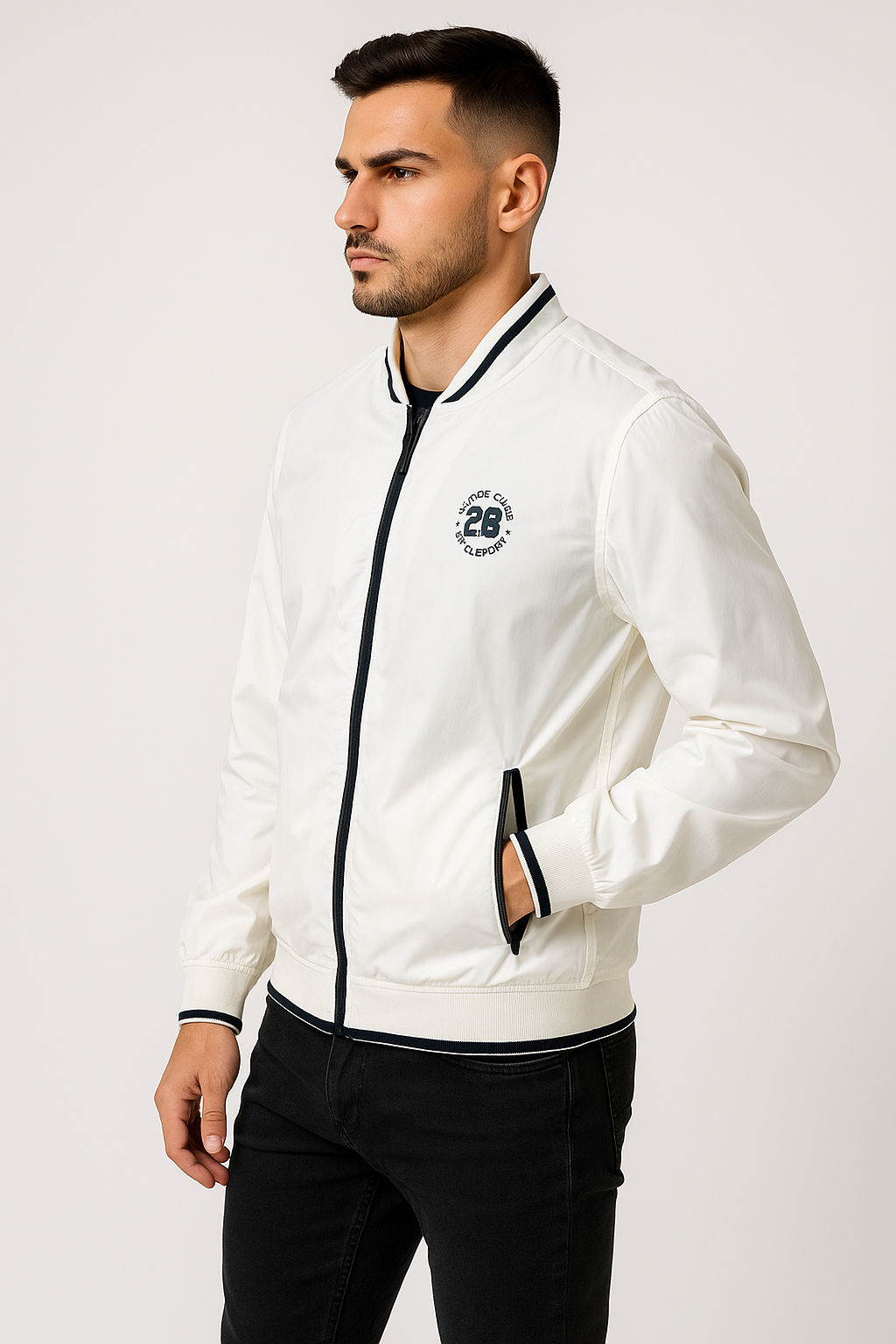 White solid windcheater sporty jacket, 2 pockets ,has a zip closure, long sleeves, straight hemline, polyester lining